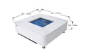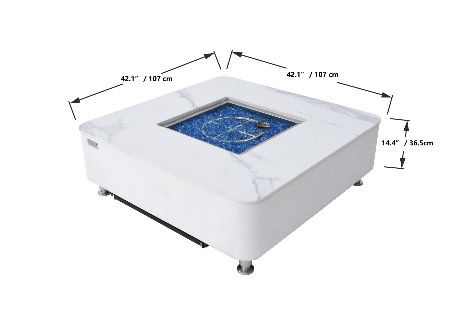 The Annecy Modern Marble and Concrete Square Fire Pit Table comes with fire media (Caribbean Blue Fire Glass) and a durable fabric weather cover to protect the fire pit from harsh weather conditions when not in use. The porcelain marble lid is also included, which can be used to cover the burner pan when the fire pit is not in use, converting the fire pit table into a stylish and functional table.