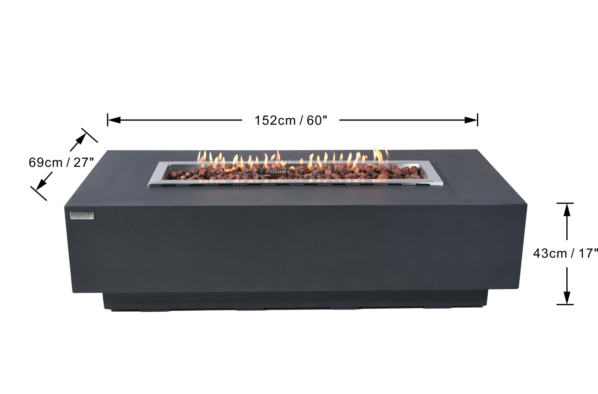 This rectangle fire pit table measures 60" L x 27" W x 17" H, fitting perfectly in outdoor spaces.